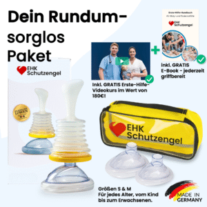 Wenn sich der Fremdkörper nicht löst, kann der EHK-Schutzengel helfen, den Gegenstand durch gezielten Unterdruck aus den Atemwegen zu entfernen – sanft, schnell und ohne komplizierte Handgriffe. Sollte das Kind bewusstlos werden oder keine Luft mehr bekommen, ist sofort der Notruf 112 zu wählen und mit Wiederbelebungsmaßnahmen zu beginnen.