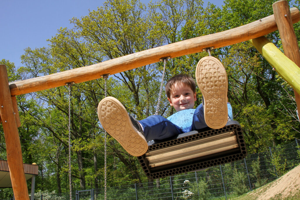 Jeder sollte das fürs Schaukeln typische Gefühl von Leichtigkeit erfahren dürfen. Aus diesem Grund gibt es auch unter den Schaukelarten barrierefreie Spielgeräte für Menschen mit körperlichen Einschränkungen. Die sogenannten Integrationsschaukeln bieten sogar Rollstuhlfahrer:innen die Möglichkeit, in Schwung zu kommen. Der Rollstuhl wird dazu einfach auf die Plattform gefahren und befestigt, bevor jemand wie bei einer regulären Schaukel anschubsen kann. So kann die Bindung zwischen Eltern und Kindern aber auch Geschwistern oder Freunden gefestigt werden.